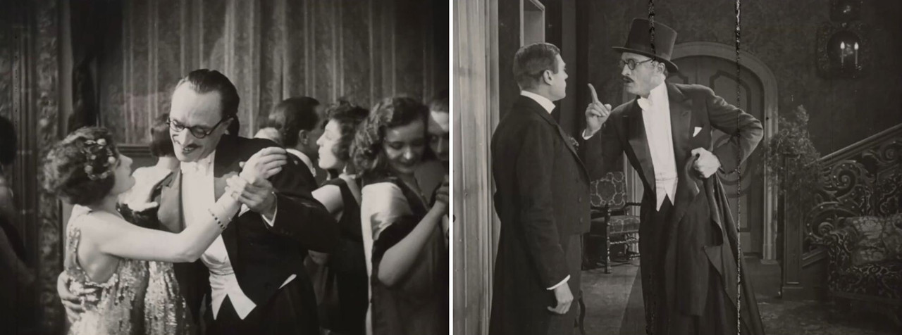 Liebe macht blind is noteworthy among Conrad Veidt fans for being the only traditional comedy in his body of work. Known primarily in the silent era for his dramatic roles, from the truly sinister to the more mundane, Connie just wasn't considered a comedian. Despite there being evidence of his sense of humor and comedic timing, especially in later films (see 1940's Contraband and 1943's Above Suspicion), he is to this day seen as "the man with wicked eyes", "demon of the silver screen". But in reality, Connie had great versatility as an actor; his enduring image as a villain has more to do with which of his films are considered important for whatever reason than his ability as a performer. Reviews reacting to the original release as well as the few from folks who attended the Valparaíso Recovered Film Festival all express surprise at how well-suited to comedy Connie was. The stills we have from the film show him with slicked back hair and a funny little mustache, in black tie with an a-typical pair of thick glasses instead of his signature monocle. In a number of these shots, he looks uncharacteristically awkward rather than dashing or menacing.